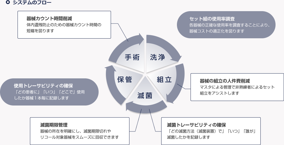 電子マネーや電車等の乗車カードのような非接触ICカードと同様の技術である新しい個体識別技術であるRFID技術のタグを、手術器械(鋼製小物等)1本1本に取付け、手術器械を管理・利用する様々なシーンでの医療スタッフの負荷を軽減、医療安全の担保をの強化を目的とした鋼製小物の個体管理システムです